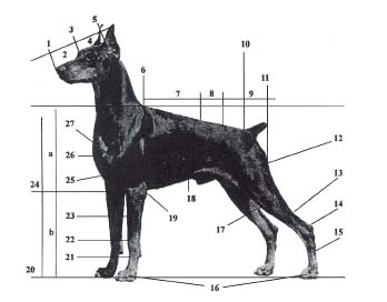 REGIÃO CRANIANA: forte em proporção ao corpo. Vista por cima, a cabeça tem a forma de uma cunha. Vista pela frente, a linha do crânio deve ser quase plana sem cair para as orelhas. A linha do focinho se estende quase reta, em relação à linha superior do crânio, a qual cai suavemente arredondada para a linha do pescoço. A arcada superciliar é bem desenvolvida, sem ser proeminente. O sulco sagital é ainda visível. O occipital não deve ser eminente. Vista de frente e de cima, os lados da cabeça não devem ser protuberantes. A ligeira protuberância entre a parte posterior do osso maxilar superior e o osso malar deve estar em harmonia com o comprimento total da cabeça. Os músculos da cabeça devem ser bem desenvolvidos. Stop: leve, mas visivelmente desenvolvido. REGIÃO FACIAL Trufa: narinas bem desenvolvidas, mais para largas que para redondas, com aberturas amplas, sem serem proeminentes. Preta, em cães pretos; nos cães marrons, tons correspondentes mais claros. Focinho: deve estar em proporção com o crânio, ser fortemente desenvolvido e profundo. A abertura da boca deve ser ampla, alcançando os molares. Uma boa largura do focinho também deve estar presente nas partes superior e inferior dos incisivos. Lábios: devem ser firmes e lisos, bem juntos aos maxilares, o que proporciona uma correta oclusão da boca. O pigmento das gengivas deve ser escuro; nos cães marrons um tom ligeiramente mais claro. Maxilares / Dentes: poderosos maxilares, tanto o superior quanto o inferior; mordedura em tesoura; 42 dentes corretamente colocados e de tamanho normal. Olhos: de tamanho médio, ovais (preferencialmente amendoados) e de cor escura. Nuanças mais claras são permitidas em cães marrons. Pálpebras bem aderentes e revestidas por pêlos. Alopecia (é o mesmo que falta de pêlos) ao redor dos olhos é altamente indesejável. Orelhas: de inserção alta, portadas eretas e cortadas com um comprimento proporcional à cabeça. Nos países onde o corte é proibido, as orelhas inteiras são igualmente reconhecidas (de preferência, tamanho médio e com a borda anterior caindo rente às bochechas). PESCOÇO: de bom comprimento, proporcional ao corpo e à cabeça. É seco e musculoso. Seu contorno é ascendente e ligeiramente curvado. Seu porte é ereto e demonstra muita nobreza. TRONCO Cernelha: pronunciada em comprimento e altura, especialmente nos machos, determinando, assim, uma linha superior ascendente da garupa para a cernelha. Dorso: curto e firme, de boa largura e bem musculoso. Lombo: de boa largura e bem musculoso. A fêmea pode ser ligeiramente mais longa no lombo porque ela requer de espaço para amamentar. Garupa: levemente caída, dificilmente perceptível do osso sacro à raiz da cauda, parecendo assim bem arredondada, sem ser horizontal nem caída. Boa largura com forte musculatura. Peito: o comprimento e a profundidade devem ser bem proporcionais ao comprimento do corpo. A profundidade com costelas ligeiramente arqueadas, deve ser de, aproximadamente, 50% da altura do cão na cernelha. Peito de boa largura e especialmente bem desenvolvido no antepeito. Linha inferior: da ponta do esterno à pélvis, a linha inferior é perceptivelmente esgalgada. CAUDA: de inserção alta e amputada curta, de forma que duas vértebras caudais permaneçam visíveis. Nos países onde a caudectomia é proibida, a cauda permanece natural. MEMBROS ANTERIORES Generalidades: vistos de qualquer ângulo, são quase retos, verticais para o solo e fortemente desenvolvidos. Ombros: escápula bem ajustada contra o tórax, bem musculosos em ambos os lados da borda da escápula e ultrapassa o ápice da vértebra torácica, o mais inclinada possível e bem colocada para trás. O ângulo com a horizontal é de aproximadamente, 50%. Braços: de bom comprimento, bem musculosos, o ângulo com a escápula é de aproximadamente 105° a 110°. Cotovelos: bem ajustados, sem virarem para fora. Antebraços: fortes e retos. Bem musculosos. Comprimento em harmonia com o corpo inteiro. Carpos: fortes. Metacarpos: ossatura forte. Vistos de frente, retos. Vistos de perfil, com uma ligeira inclinação, máximo 10°. Patas anteriores: curtas e fechadas. Dedos bem arqueados para cima (pés-de-gato). Unhas curtas e pretas. POSTERIORES Generalidades: vistos por trás, o Dobermann parece, por causa do seu bom desenvolvimento muscular pélvico nas ancas e garupa, largo e arredondado. Os músculos, que vão da bacia para a coxa e a perna resultam em uma largura bem desenvolvida, na região da coxa, na articulação do joelho e na perna. Os posteriores são fortes, retos e paralelos. Coxas: de bom comprimento e largura, bem musculosas. Boa angulação da articulação coxofemoral. Angulação com a horizontal de aproximadamente 80° a 85°. Joelhos: articulação forte, formada pela coxa, perna, bem como a rótula. A angulação do joelho é de 130°. Pernas: de comprimento médio e em harmonia com o comprimento total dos membros posteriores. Jarretes: medianamente fortes e paralelos. A tíbia articula-se com o metatarso na articulação do jarrete (ângulo em torno de 140°). Metatarsos: curtos e verticais ao solo. Patas posteriores: assim como os anteriores, os dedos são curtos, arqueados e compactos. Unhas curtas e pretas. MOVIMENTAÇÃO: de especial importância tanto para o trabalho quanto para a aparência externa. Movimentação elástica, elegante, ágil, livre e boa cobertura de solo. Os anteriores alcançam o mais longe possível. Os posteriores fornecem a impulsão necessária pela elasticidade de seus movimentos. O anterior de um lado e o posterior de outro se movimentam ao mesmo tempo. Deve apresentar boa estabilidade no dorso, nos ligamentos e articulações. PELE: bem ajustada por todo corpo e bem pigmentada. PELAGEM Pêlos: curtos, duros e espessos. Muito bem assentados, lisos e igualmente distribuídos sobre toda a superfície. Subpêlos não são admitidos. COR: preto ou marrom, com marcações vermel